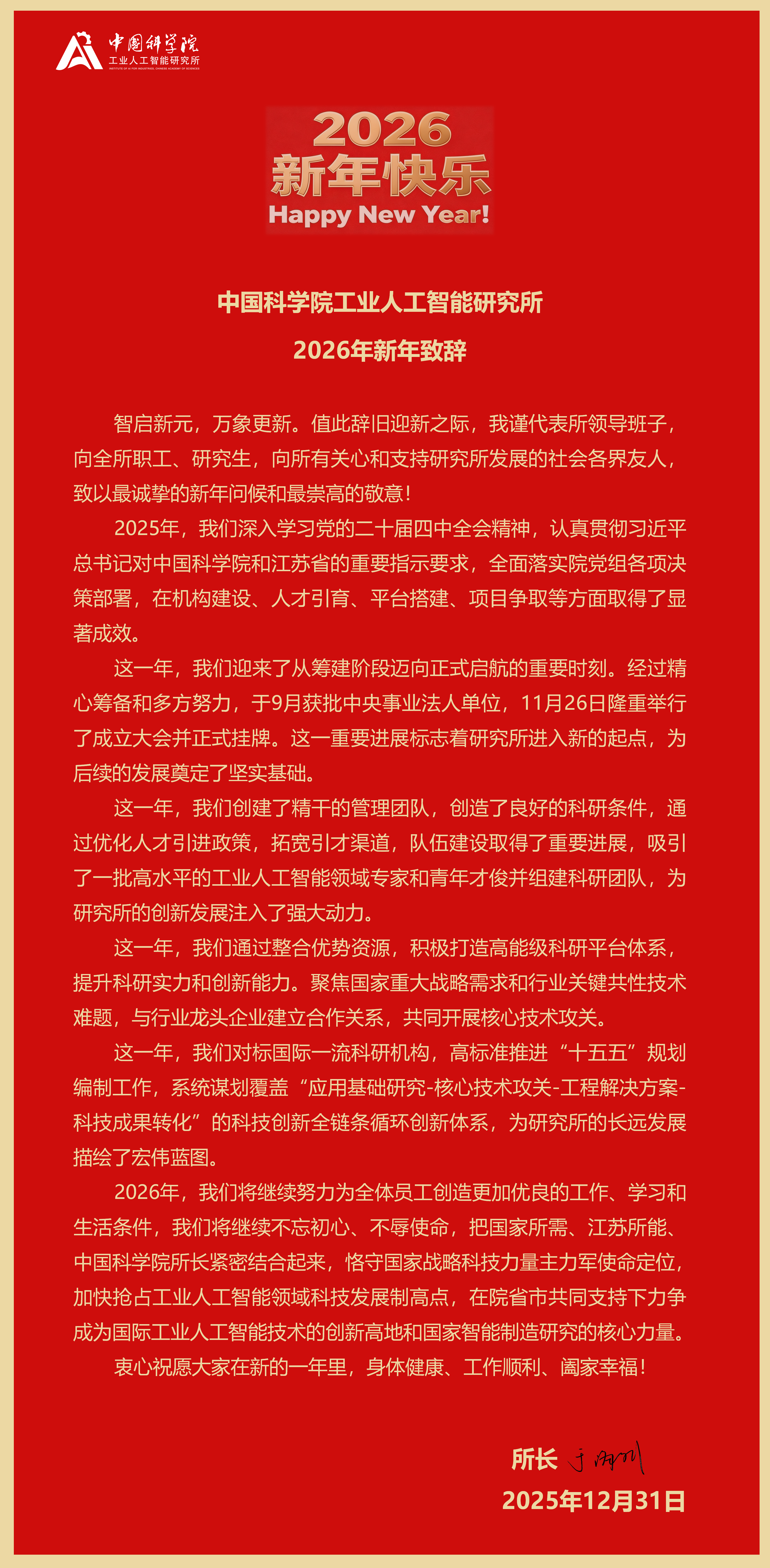 中国科学院工业人工智能研究所2026年新年致辞